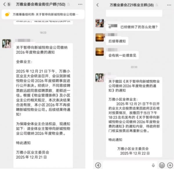 10 天逼退物业,罔顾小区日常管理,要求全体业主暂停缴纳 2026 年物业费,变相逼迫现有物业 1 月 1 日 “卷铺盖走人”。按照规定,解聘物业需完成核票、公示、招投标等一系列流程。业委会 12 月 21 日发通知,1 月 1 日就要清退物业,不仅无视法定程序,更涉嫌违规解除合同,难道准备自行赔付违约金?