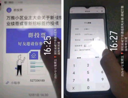 这场违规大戏还有 “前奏花絮”,业委会曾宣称 “联合社区跑票 + 小程序线上投票”,但直至大会结束,无任何业主见过电话投票、上门投票的书面材料。更离谱的是,线上投票小程序只是群投票链接,无需验证业主身份,错误身份证也能投票、刷票,而所谓 “跑票” 从 11 月 18 日就已开始,所有票据由个人带回家操作,全程无监控 —— 这样的投票结果,如何服众?