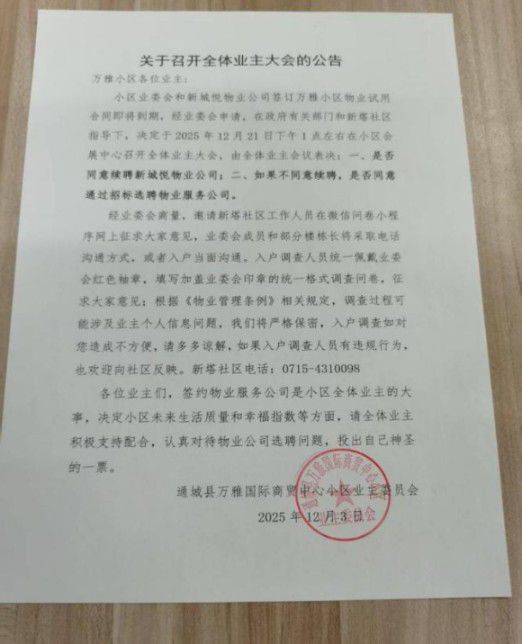 业委会本应是业主与物业的桥梁,却沦为少数人谋利的工具。通城县万雅国际的这场 “魔幻大会”,并非个例 —— 去年业委会成立时的违规场景更甚。营商环境是地方发展的基本盘,若有关部门监管缺位,任由 “物闹” 势力践踏规则,最终损害的是全体业主的利益。
